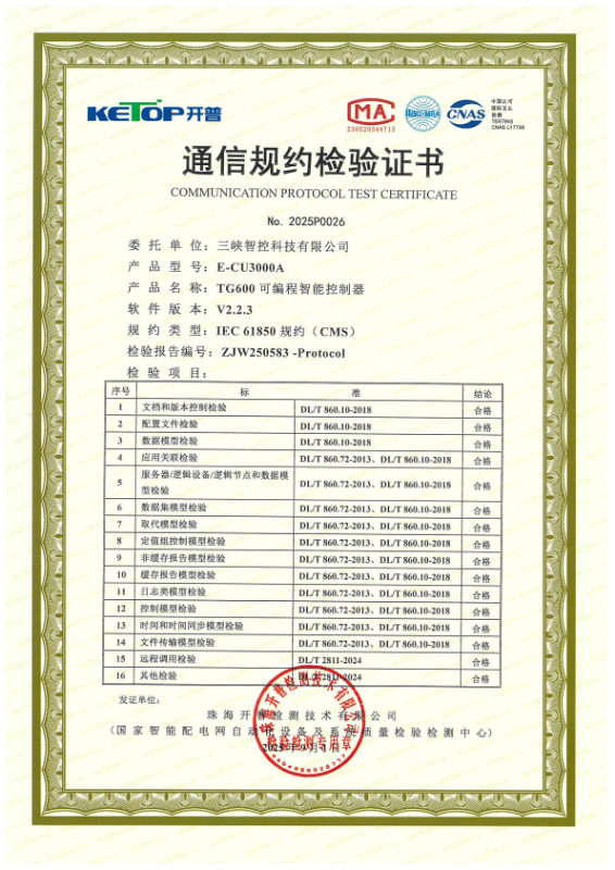 目前,TG系列全國(guó)產(chǎn)化智能勵(lì)磁系統(tǒng)已通過(guò)工信部電子五所全國(guó)產(chǎn)化認(rèn)證和代碼安全審計(jì)、中國(guó)電科院型式試驗(yàn)認(rèn)證、華北電科院涉網(wǎng)性能檢測(cè)、開(kāi)普實(shí)驗(yàn)室“國(guó)家智能電網(wǎng)自動(dòng)化設(shè)備及系統(tǒng)質(zhì)量檢驗(yàn)檢測(cè)中心”智能電站通信規(guī)約(IEC61850)檢測(cè)。
